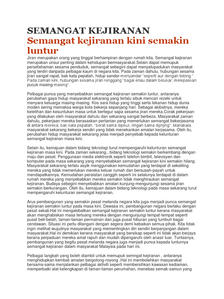 Penggunaan idea atau isi-isi penting yang relevan mengikut tajuk atau tema soalan. Semangat kejiranan dalam kalangan rakyat Malaysia semakin longgar. Ipendidikan Karangan Langkah Dan Usaha Memupuk Semangat Kejiranan Dalam Kalangan Masyarakat Disemak dan dikemaskini pada pukul 911 pm 4 Oktober 2020 Soalan berkaitan semangat kejiranan kerap digunakan oleh sekolah untuk menguji tahap penulisan para pelajar.